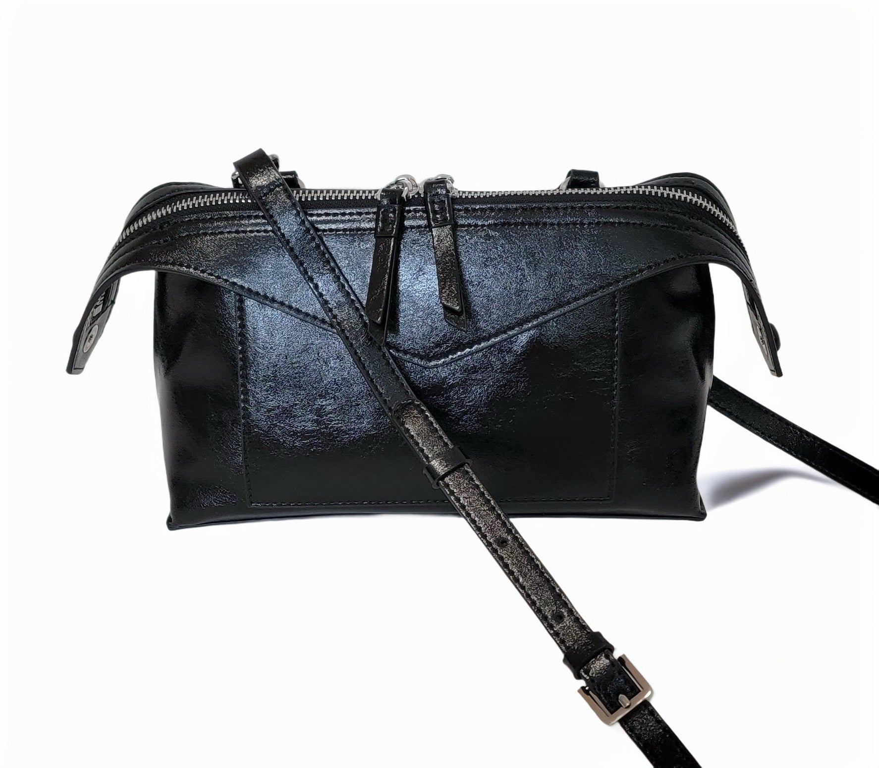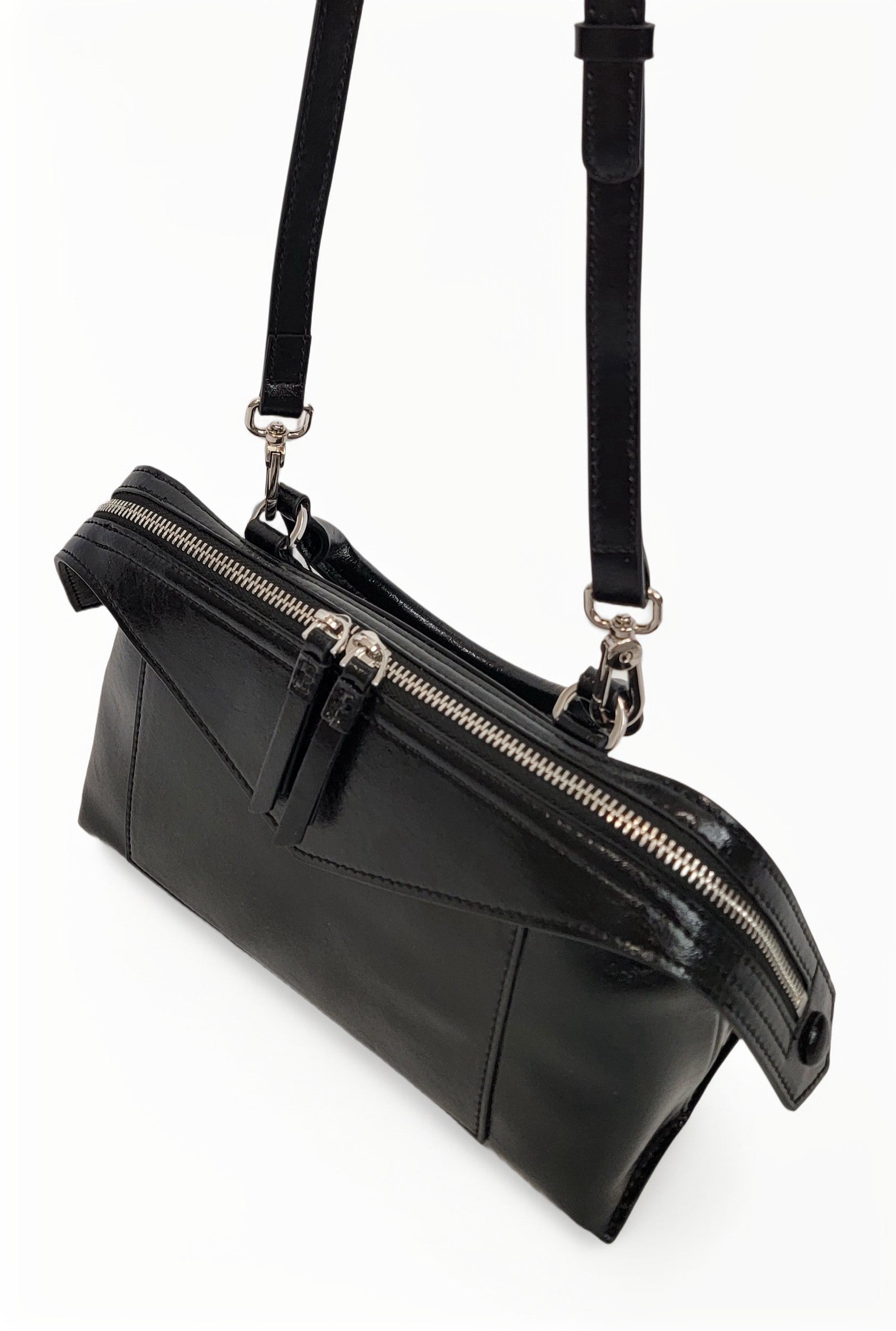 A small, structured silhouette in smooth genuine leather. Carry it by the elegant top handle or wear it effortlessly as a crossbody.
