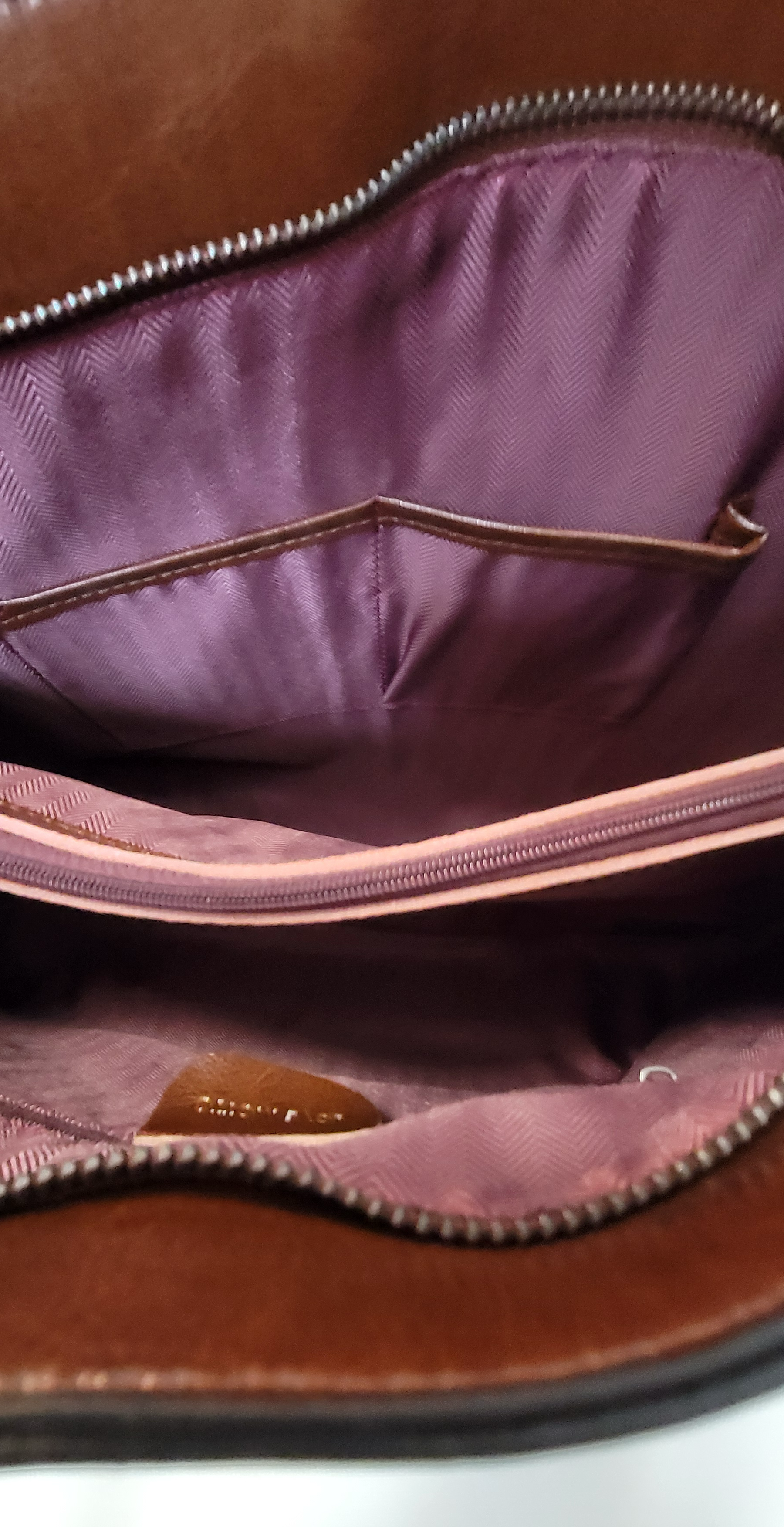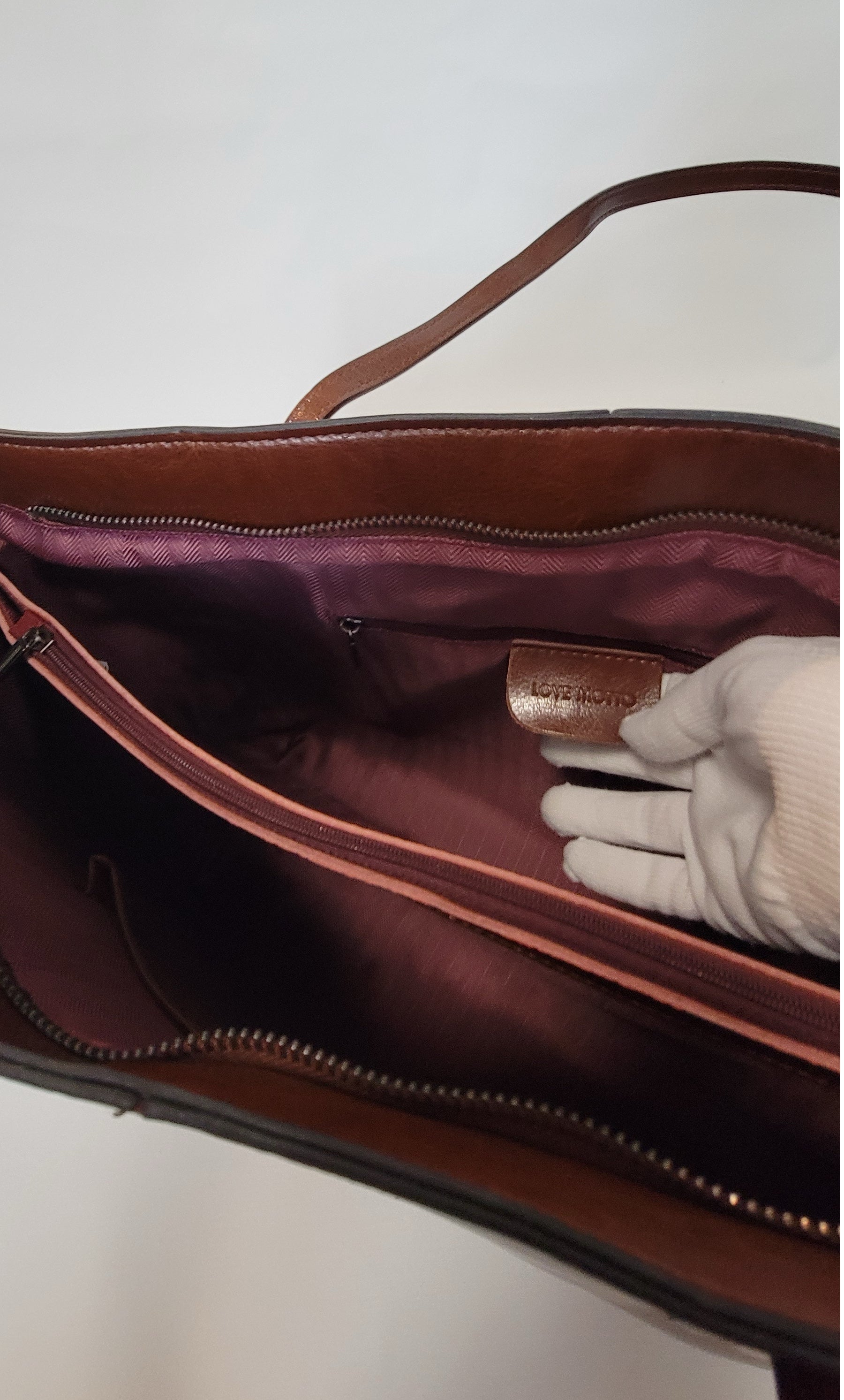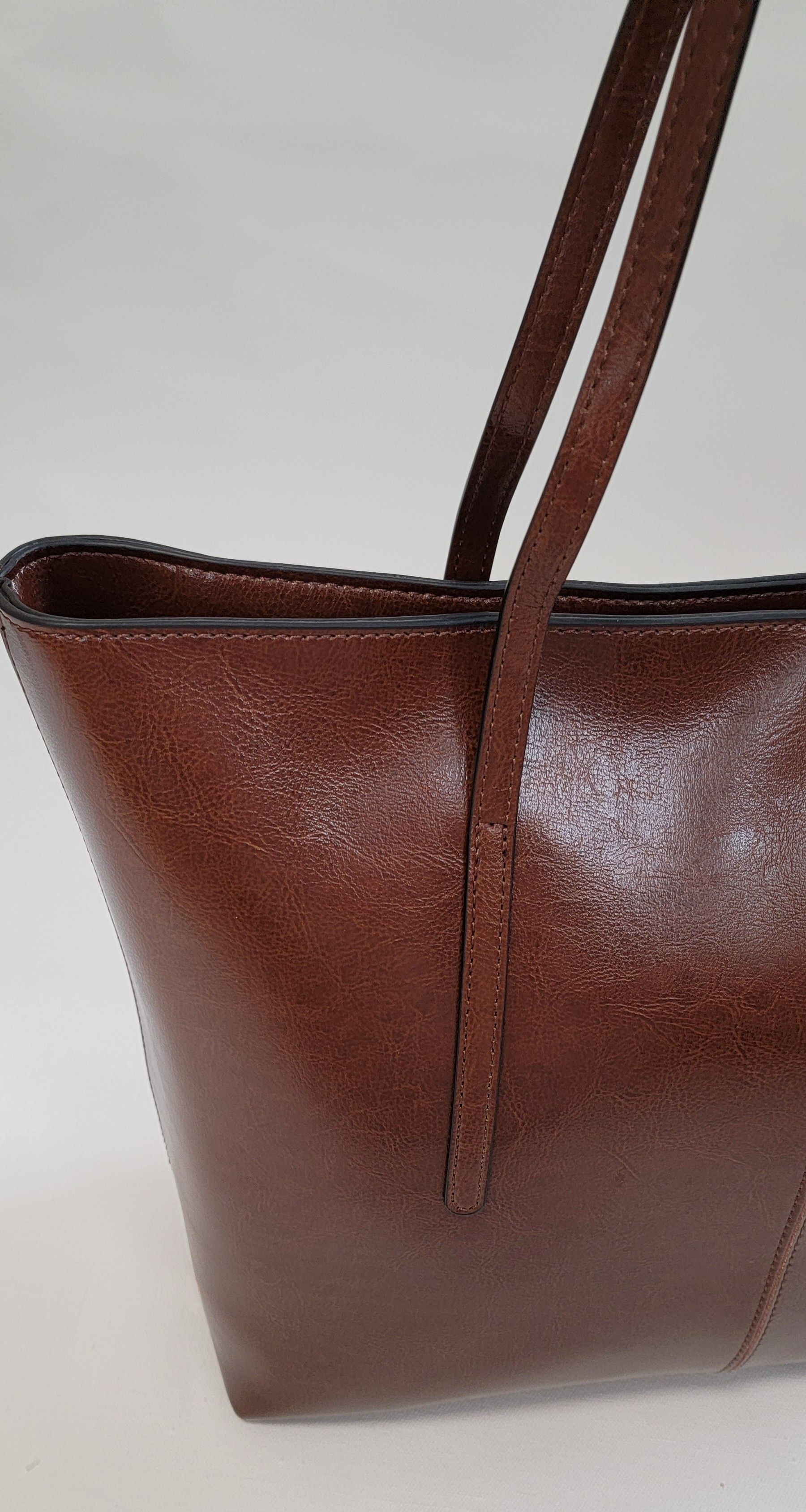 Genuine leather tote with a radiant, glossy exterior and a distinctive flared (trapezoid) design.